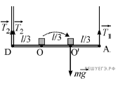 1. При начальном положении грузика очевидно, что все три нити имеют одинаковую силу натяжения T, и в силу условий равновесия твердого тела в ИСО