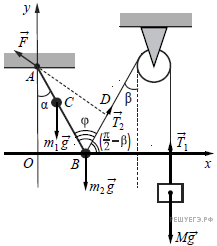 Невесомый стержень АВ с двумя малыми грузиками массами m1 = 200 г и m2 = 100 г, расположенными в точках C и B соответственно, шарнирно закреплен в точке А. Груз массой M = 100 г подвешен к невесомому блоку за невесомую и нерастяжимую нить, другой конец которой соединен с нижним концом стержня, как показано на рисунке. Вся система находится в равновесии, если стержень отклонен от вертикали на угол