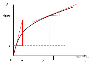 Груз совершает малые вертикальные колебания вокруг положения равновесия. В случае груза массой m положению равновесия соответствует растяжение жгута, обозначенное на рисунке буквой A, при массе груза 4m — растяжение жгута, обозначенное буквой B. Поскольку зависимость силы упругости от удлинения жгута нелинейная, коэффициент жесткости зависит от растяжения, геометрически его значение при определенном растяжении равно тангенсу угла наклона графика в соответствующей точке.