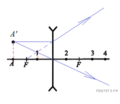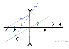 Построим ее изображение по обычным правилам и опустим перпендикуляр на главную оптическую ось. Снова получаем, что изображение находится в точке 1.