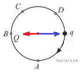 Таким образом, поскольку заряды q и Q имеют одинаковые знаки, заключаем, что модуль напряженности электрического поля, создаваемого этими зарядами в центре окружности, будет минимален, когда поля будут максимально компенсировать друг друга (будут иметь противоположные направления), то есть заряд Q нужно расположить в точке B.