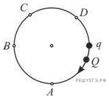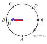 Таким образом, поскольку заряды q и Q имеют противоположные знаки, заключаем, что модуль напряженности электрического поля, создаваемого этими зарядами в центре окружности, будет максимален, когда поля будут максимально усиливать друг друга (будут иметь одинаковое направления), то есть заряд Q нужно расположить в точке B.