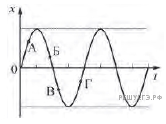 Версия для печати и копирования в MS WordТочечное тело совершает гармонические колебания вдоль оси ОХ. На рисунке изображена зависимость смещения х этого тела от времени t. Проекция скорости тела на ось ОХ отрицательна в точках