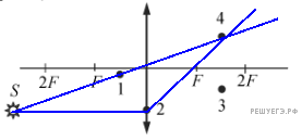 Построив лучи, получаем изображение точки S в точке их пересечения 4.