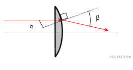 При переходе из оптически более плотной среды в менее плотную, луч отклоняется от нормали, как показано на рисунке. Пустим луч параллельно главной оптической оси, тогда после преломления он пойдет в точку фокуса. Запишем закон преломления для двух случаев и сравним угол преломления