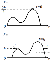 На гладкой горизонтальной поверхности стола покоится горка с двумя вершинами, высоты которых h и (см. рисунок). На правой вершине горки находится шайба. От незначительного толчка шайба и горка приходят в движение, причем шайба движется влево, не отрываясь от гладкой поверхности горки, а поступательно движущаяся горка не отрывается от стола. Скорость шайбы на левой вершине горки оказалась равной υ. Найдите отношение масс шайбы и горки.