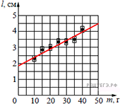 На графике представлены результаты измерения длины пружины при различных значениях массы грузов, лежащих в чашке пружинных весов (см. рис.). С учетом погрешностей измерений (Δm = ±1 г; Δl = ±0,2 см) найдите длину пружины, когда на чашке весов лежит груз массой 50 г.