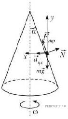 Полый конус с углом при вершине 2α вращается с угловой скоростью ω вокруг вертикальной оси, совпадающей с его осью симметрии. Вершина конуса обращена вверх. На внешней поверхности конуса находится небольшая шайба, коэффициент трения которой о поверхность конуса равен μ. При каком максимальном расстоянии L от вершины шайба будет неподвижна относительно конуса? Сделайте схематический рисунок с указанием сил, действующих на шайбу.