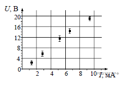 В школьной лаборатории получена зависимость напряжения между концами проводника от силы протекающего по нему постоянного тока (см. рис.). Каково примерно сопротивление этого проводника по результатам проведенных измерений?