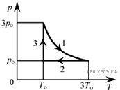 Над одноатомным идеальным газом проводится циклический процесс, показанный на рисунке. На адиабате 3–1 внешние силы сжимают газ, совершает работу