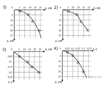 Погрешность измерения координат равна 1 см, а промежутков времени — 0,01 с. На каком из графиков верно представлена наиболее вероятная траектория движения шарика?