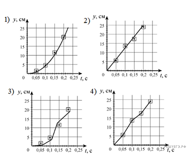 Погрешность измерения координат равна 1 см, а промежутков времени — 0,01 с. На каком из графиков верно построена зависимость координаты у шарика от времени t?