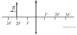 Предмет, расположенный на двойном фокусном расстоянии от тонкой собирающей линзы, передвигают к тройному фокусу (см. рисунок). Его изображение при этом движется