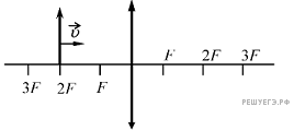 Предмет, расположенный на двойном фокусном расстоянии от тонкой собирающей линзы, передвигают к фокусу линзы (см. рисунок). Его изображение при этом движется от двойного фокуса