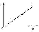 При переводе идеального газа из состояния 1 в состояние 2 концентрация молекул n пропорциональна давлению р (см. рис.). Масса газа в процессе остается постоянной. Утверждается, что в данном процессе