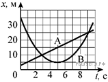 На рисунке приведены графики зависимости координат от времени для двух тел: А и В, движущихся по прямой, вдоль которой и направлена ось Oх. Выберите верное(-е) утверждение(-я) о характере движения тел.