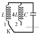 Как изменится период собственных электромагнитных колебаний в контуре (см. рисунок), если ключ К перевести из положения 1 в положение 2?