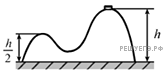 Горка с двумя вершинами, высоты которых h и покоится на гладкой горизонтальной поверхности стола (см. рисунок). На правой вершине горки находится монета. От незначительного толчка монета и горка приходят в движение, причем монета движется влево, не отрываясь от гладкой поверхности горки, а поступательно движущаяся горка не отрывается от стола. В некоторый момент времени монета оказалась на левой вершине горки, имея скорость
