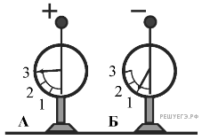 На рисунке изображены два одинаковых электрометра: А и Б, шары которых имеют заряд противоположных знаков. Какими станут показания электрометров, если их шары соединить проволокой?