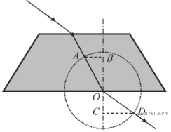 На рисунке показан ход светового луча сквозь стеклянную призму, находящуюся в воздухе. Tочка О — центр окружности.