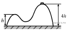 На гладкой горизонтальной поверхности стола покоится горка с двумя вершинами, высоты которых h и 4h (см. рисунок). На правой вершине горки находится шайба. Масса горки в 8 раз больше массы шайбы. От незначительного толчка шайба и горка приходят в движение, причем шайба движется влево, не отрываясь от гладкой поверхности горки, а поступательно движущаяся горка не отрывается от стола. Найдите скорость шайбы на левой вершине горки.