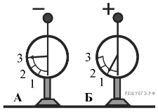На рисунке изображены два одинаковых электрометра, шары которых имеют заряды противоположных знаков. Если их шары соединить проволокой, то показания обоих электрометров