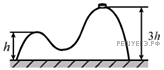 Горка с двумя вершинами, высоты которых h и 3h, покоится на гладкой горизонтальной поверхности стола (см. рисунок). На правой вершине горки находится шайба, масса которой в 12 раз меньше массы горки. От незначительного толчка шайба и горка приходят в движение, причем шайба движется влево, не отрываясь от гладкой поверхности горки, а поступательно движущаяся горка не отрывается от стола. Найдите скорость горки в тот момент, когда шайба окажется на левой вершине горки.