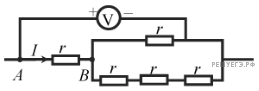 Пять одинаковых резисторов с сопротивлением r = 1 Ом соединены в электрическую цепь, схема которой представлена на рисунке. По участку АВ идет ток I = 4 А. Какое напряжение показывает идеальный вольтметр?