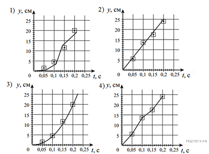 Погрешность измерения координат равна 1 см, а промежутков времени — 0,01 с. На каком из графиков верно построена зависимость координаты у шарика от времени t?