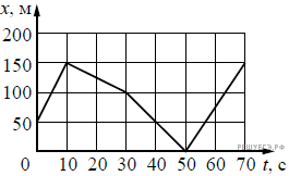 На рисунке представлен график зависимости координаты х велосипедиста от времени t. На каком интервале времени проекция скорости велосипедиста на ось Оx υx = −2,5 м/с?