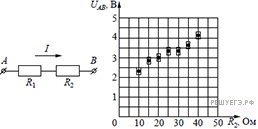На графике представлены результаты измерения напряжения на концах участка AB цепи постоянного тока, состоящего из двух последовательно соединенных резисторов, при различных значениях сопротивления резистора R2 и неизменной силе тока I (см. рис.). С учетом погрешностей измерений (ΔR = ±1 Ом; ΔU = ±0,2 В) найдите сопротивление резистора R2, при котором напряжение на концах участка цепи АВ равно 4,5 В.