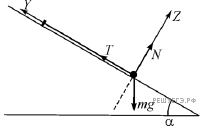 2. Введем систему координат, у которой ось Z направлена перпендикулярно наклонной плоскости, ось Y — вверх, вдоль нити в положении равновесия, а ось X — перпендикулярно нити вдоль плоскости. Нарисуем силы, действующие на грузик (силу тяжести mg, силу нормальной реакции N и силу натяжения нити T), и изобразим вид системы сбоку, вдоль плоскости (см. рис.).