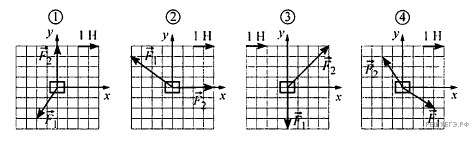 Точечное тело массой 1 кг двигалось по горизонтальной плоскости ХОY. К телу приложили две силы (векторы обеих сил лежат в данной плоскости), под действием которых оно начало двигаться с ускорением. На рисунке изображена зависимость проекции υ, скорости этого тела на ось ОХ от времени t. На каком из следующих рисунков правильно изображены силы, действующие на тело?