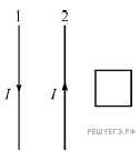 Два длинных прямых провода расположены параллельно друг другу. В одной плоскости с ними лежит квадратный проволочный контур, две стороны которого параллельны проводам. По проводам текут одинаковые электрические токи силой I, направленные в противоположные стороны. Электрический ток в проводе 1 начинает уменьшаться. Индукционный ток, который при этом будет протекать по квадратному контуру,
