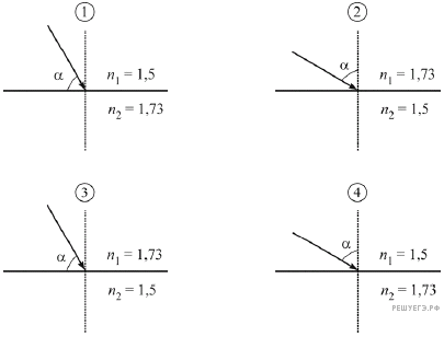 Известно, что для двух сред с некоторыми показателями преломления n1 и n2 явление полного внутреннего отражения на их границе начинает наблюдаться при угле падения света α = 60°. Какой из рисунков соответствует этому?