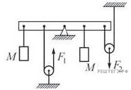 Чтобы уравновесить на легкой рейке с помощью двух невесомых блоков одинаковые грузы массой М каждый, к нити, перекинутой через левый блок, и к оси правого блока необходимо приложить вертикальные силы F1 и F2 (см. рис.). Расстояния между черными точками на рейке одинаковы, трение отсутствует, нити нерастяжимы.