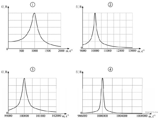 Колебательный контур состоит из последовательно соединенных резистора, конденсатора емкостью 10 мкФ и катушки индуктивностью 1 мГн. Какая из приведенных на рисунке резонансных кривых может принадлежать этому контуру?