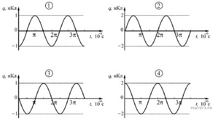 На рисунке a приведен график зависимости изменения заряда конденсатора в колебательном контуре от времени. На каком из графиков — 1, 2, 3, или 4 (рис. б) — изменение силы тока показано правильно? Колебательный контур считать идеальным.