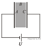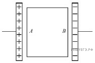 Между обкладками плоского конденсатора помещают пластину из диэлектрика. Плоские поверхности A и B пластины параллельны обкладкам. Конденсатор заряжают так, как показано на рисунке. Какие электрические заряды преобладают на поверхностях A и B пластины?