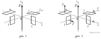 Четыре металлические рамки находятся в однородном магнитном поле. Направление вектора магнитной индукции и начальное расположение рамок показано на рис. 1: плоскости рамок 1 и 4 перпендикулярны оси 0z, плоскость рамки 2 перпендикулярна оси 0y и плоскость рамки 3 перпендикулярна оси 0x.