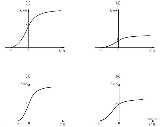 В опыте по изучению фотоэффекта одну из пластин плоского конденсатора облучают светом с энергией фотона 5 эВ. Напряжение между пластинами изменяют с помощью реостата, силу фототока в цепи измеряют амперметром. Работа выхода электрона с поверхности металла, из которого сделаны пластины конденсатора, равна 4 эВ. На каком рисунке правильно изображен график зависимости фототока I от напряжения U между пластинами?