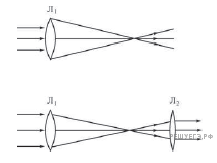 Школьник проводит опыты с двумя линзами, направляя на них параллельный пучок света. Ход лучей в этих опытах показан на рисунках. Согласно результатам этих опытов, фокусное расстояние линзы