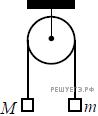Брусок массой М = 300 г соединен с грузом массой m = 200 г невесомой и нерастяжимой нитью, перекинутой через невесомый блок (см. рис.). Брусок скользит без трения по неподвижной наклонной плоскости, составляющей угол 30° с горизонтом. Чему равно ускорение груза m? Ответ приведите в метрах на секунду в квадрате.