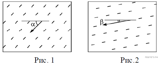 Школьник, возвращаясь домой с занятий по подготовке к ЕГЭ по физике, сел на вокзале в стоящую электричку. В это время пошел сильный снег, и вдоль поезда начал дуть ветер с постоянной скоростью. При этом поток падающих за окном снежинок выглядел так, как показано на рис. 1. Потом поезд поехал, и после его разгона наблюдаемая через окно картина изменилась (см. рис. 2). Углы наклона к горизонту прямолинейных траекторий снежинок в первом и во втором случаях были равны и