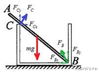Однородный стержень АВ массой m = 100 г покоится, упираясь в стык дна и стенки банки концом В и опираясь на край банки в точке С (см. рис.). Модуль силы, с которой стержень давит на стенку сосуда в точке С, равен 0,5 Н. Чему равен модуль вертикальной составляющей силы, с которой стержень давит на сосуд в точке В, если модуль горизонтальной составляющей этой силы равен 0,3 Н? Трением пренебречь. Ответ укажите в ньютонах с точностью до одного знака после запятой.