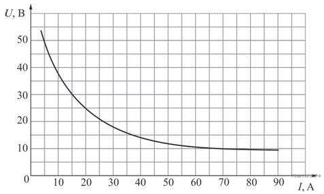На рисунке показан участок вольт-амперной характеристики для сварочной дуги. Из рисунка следует, что при увеличении силы тока в дуге от 15 до 70