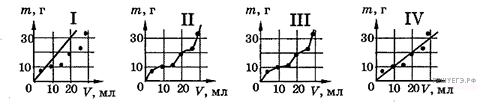На четырех графиках точками отмечены результаты измерений массы жидкости в зависимости от ее объема. Погрешность измерений массы — 2,5 г, объема — 5 мл. Какой из графиков проведен правильно с учетом всех результатов измерений и их погрешностей?
