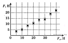 бруска. Эту гипотезу он решил проверить экспериментально. Положив на горизонтальную поверхность стола деревянный брусок с разными грузами, ученик равномерно тянул его, измеряя силу F динамометром. Результаты измерений значений F при разных значениях силы тяжести бруска с грузами отмечены на координатной плоскости {