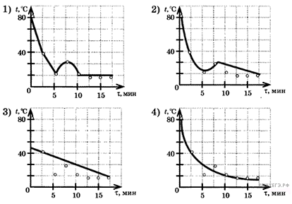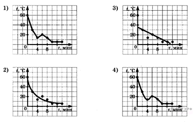 На рисунке точками отмечены результаты измерения температуры t остывающей воды в разные моменты времени Какой из графиков зависимости температуры от времени — 1, 2, 3, или 4 — построен по этим точкам наиболее точно?