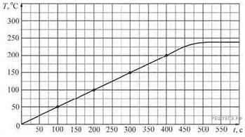 Олово массой 200г с начальной температурой 0 °C нагревают в тигле на электропечи мощностью На рисунке приведен экспериментально полученный график зависимости температуры T олова от времени